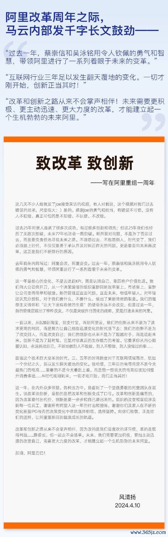 ![]() 新浪科技讯 4月10日上午消息,今天,马云在阿里内网发表题为《致改革 致创新》的帖子,高度肯定蔡崇信和吴泳铭组成的新管理层的变革勇气,称阿里巴巴已重回健康成长轨道,并支持继续改革。据悉,这是退休后的马云五年来首次长篇幅分享对公司改革创新及未来前景的思考。 马云在文中认为,过去这一年阿里最核心的变化,不是去追赶KPI,而是认清自己,重回客户价值轨道。通过向大公司病开刀,阿里重新回归效率至上、市场至上,变得简单和敏捷。 他认为新管理层“直面问题、直面未来,相信年轻人,对年轻团队充分授权,对于我们要什么,不要什么,做出了果断清晰的取舍”“不仅是突破昨日固化的战略,更是打造未来的阿里”。针对行业未来,马云判断“三、五年的时间跨度对于互联网领域而言,犹如一个世纪之久,足以发生翻天覆地的变化,AI时代刚刚到来,一切才刚开始,我们正当其时!” 据阿里内部人士称,马云在这篇帖文中落款花名“风清扬”,笔调坚定乐观,“马老师这些年虽然不在具体管理岗位,但作为创始人,总在公司发展关键时刻站出来,给员工解惑、鼓劲”。 全文如下: 致改革 致创新 ——写在阿里重组一周年 这几天不少人给我发了Joe接受采访的视频,有人对我说,这个视频对我们过去错误的坦承,尺度很大 : ) 是的。感谢Joe的勇气和担当,有错误不可怕,没有人不犯错,真正可怕的是不知错、不认错、不改错。 过去25年阿里人造就了很多次成功,有过很多创新和领先;但这25年我们也经历了无数次犯错,未来77年也还会一路犯错。坦然面对问题,不是为了否定过去,而是要负责任地寻找未来之路。不埋怨过去,不抱怨别人,时代变了,我们必须跟上时代,不仅仅要勇于承认并及时纠正昨天的问题,更是要面向未来而改革,这正是我们不断前行的原因。 去年我在内网写过:阿里会改,阿里会变。过去一年,蔡崇信和吴泳铭用令人钦佩的勇气和智慧,带领阿里进行了一系列着眼于未来的变革。 这一年最核心的变化,不是去追赶KPI,而是认清自己,重回客户价值轨道。我们向大公司病开刀,从一个决策缓慢的组织重新回到效率至上、市场至上,重新让公司变得简单和敏捷。新的管理层直面问题、直面未来,相信年轻人,对年轻团队充分授权,对于我们要什么,不要什么,做出了果断清晰的取舍。我们的理想主义情怀和“让天下没有难做的生意”的使命永远不会改变,但是过去一年新的管理层做出了种种改变,不仅是突破昨日固化的战略,更是打造未来的阿里。 一直以来,从B2B到淘宝,到支付宝,再到阿里云,我们的创新从来不是为了追求更高的利润,而是努力让自己能在迅速变化的时代活下去;我们的创新不是为了改变别人,而是改变自己;我们的创新也从来不是为了超越对手,而是追赶未来。创新不是为了赶时髦,它是对你真正的生存能力的考验。它要求你从内心颠覆认知,永远挑战自己,不断地做别人不敢做,别人不想做,别人没做过的事…… 面临这个技术巨大变革的时代,三、五年的时间跨度对于互联网领域而言,犹如一个世纪之久,足以发生翻天覆地的变化。我相信,三年后的电商肯定不是今天最热门的电商……重要的不是今天要赶上谁,而是想一想明天的电商应该如何提升消费体验……AI时代刚刚到来,一切才刚开始,我们正当其时! 这一年,在内外众多怀疑、各种压力中,我看到了一个坚强勇敢的阿里团队在诞生。谈改革谈创新,最怕的是把改革和创新变成了口号。改革和创新是痛苦的,因为改革要付出代价,创新是要一步步和自己磨出来的。组织的改变和重组涉及到每一位员工,谢谢所有阿里人这一年的付出和担当,谢谢你们及家人在不断的变化甚至IPO与否的决策变化中依然选择相信、选择坚持。向你们致敬,正是你们的坚持,让阿里重新回到健康成长的轨道。 改革和创新之路从来不会掌声相伴,因为改的是我们最喜欢的坏习惯,革的是既得利益……路很长,但一起走不会孤单。未来,我们需要更加积极,更加主动迅速的改变自己,需要更大力度的改革,才能建立起一个生机勃勃的未来阿里。加油,阿里巴巴!