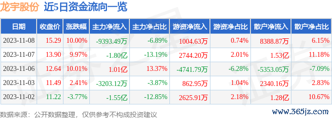证券之星消息股票网上配资平台,龙宇股份涨停收盘,收盘价15.29元。该股于9点36分涨停,10次打开涨停,截止收盘封单资金为4026.62万元,占其流通市值0.65%。 11月8日的资金流向数据方面,主力资金净流出9393.49万元,占总成交额6.89%,游资资金净流入1004.63万元,占总成交额0.74%,散户资金净流入8388.87万元,占总成交额6.15%。 ![]() 近5日资金流向一览见下表:
