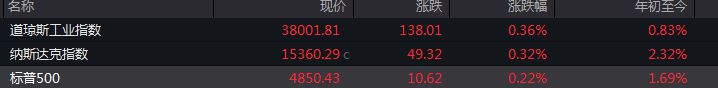 Wind截图 美东时间1月22日16:00(北京时间1月23日05:00),道指收涨138.01点,报38001.81点,涨幅为0.36%;纳指收涨49.32点,报15360.29点,涨幅为0.32%;标普500指数收涨10.62点,报4850.43点,涨幅为0.22%。继上周五后,道指、标普500指数再创收盘历史新高。道指盘中最高涨至38109.20点,标普500指数盘中最高涨至4868.41点,均创盘中新高。 美股大型科技股涨跌不一,苹果涨1.2%,亚马逊跌0.37%,奈飞涨0.57%,谷歌跌0.3%,脸书跌0.44%,微软跌0.54%。 美股银行股多数上涨,摩根大通跌0.09%,高盛涨1.01%,花旗涨2.56%,摩根士丹利涨0.47%,美国银行涨1.04%,富国银行涨0.85%。 美股航空股多数下跌,波音跌0.04%,美国航空跌0.33%,达美航空跌0.79%,西南航空涨0.6%,美联航跌0.95%。 美股能源股普遍上涨,埃克森美孚跌0.13%,雪佛龙涨0.19%,康菲石油涨0.18%,斯伦贝谢涨2.07%,西方石油涨0.57%。 热门中概股普遍下跌,纳斯达克中国金龙指数跌2.2%。世纪互联跌12.73%,虎牙直播跌12.06%,亿航智能跌8.25%,满帮集团跌5.16%,斗鱼跌5.09%,新濠博亚娱乐跌4.47%,好未来跌4.23%,新东方跌4.11%,汽车之家跌4.08%,富途控股跌3.84%;涨幅方面,盛美半导体涨5.82%,晶科能源涨3.22%,万国数据涨2.81%。中概新能源汽车股全线走低,蔚来汽车跌1.4%,小鹏汽车跌3.16%,理想汽车跌2.8%。 消息方面,据美国有线电视新闻网(CNN)报道,里士满联储主席巴尔金表示,三月份降息并非不可能。美联储理事沃勒上周则表示,没有理由像过去那样迅速采取行动或降息。美联储下一次为期两天的货币政策会议将于1月30日开始,市场普遍预计将维持利率稳定。 欧洲股市:欧洲三大股指22日全线上涨。英国伦敦股市《金融时报》100种股票平均价格指数报收于7487.71点,比前一交易日上涨25.78点,涨幅为0.35%;法国巴黎股市CAC40指数报收于7413.25点,比前一交易日上涨41.61点,涨幅为0.56%;德国法兰克福股市DAX指数报收于16683.36点,比前一交易日上涨128.23点,涨幅为0.77%。 国际油价:国际油价22日上涨。纽约商品交易所2月交货的轻质原油期货价格上涨1.78美元,收于每桶75.19美元,涨幅为2.42%;3月交货的伦敦布伦特原油期货价格上涨1.50美元,收于每桶80.06美元,涨幅为1.91%。 国际金价:纽约商品交易所黄金期货市场交投最活跃的2月黄金期价22日下跌7.1美元,收于每盎司2022.2美元,跌幅为0.35%。 ![]() 美元指数:美元指数22日上涨。衡量美元对六种主要货币的美元指数当天上涨0.04%,在汇市尾市收于103.331。截至纽约汇市尾市,1欧元兑换1.0885美元,低于前一交易日的1.0893美元;1英镑兑换1.2705美元,高于前一交易日的1.2697美元。(中新经纬APP) (文中观点仅供参考实盘股票配资网站,不构成投资建议,投资有风险,入市需谨慎。) |